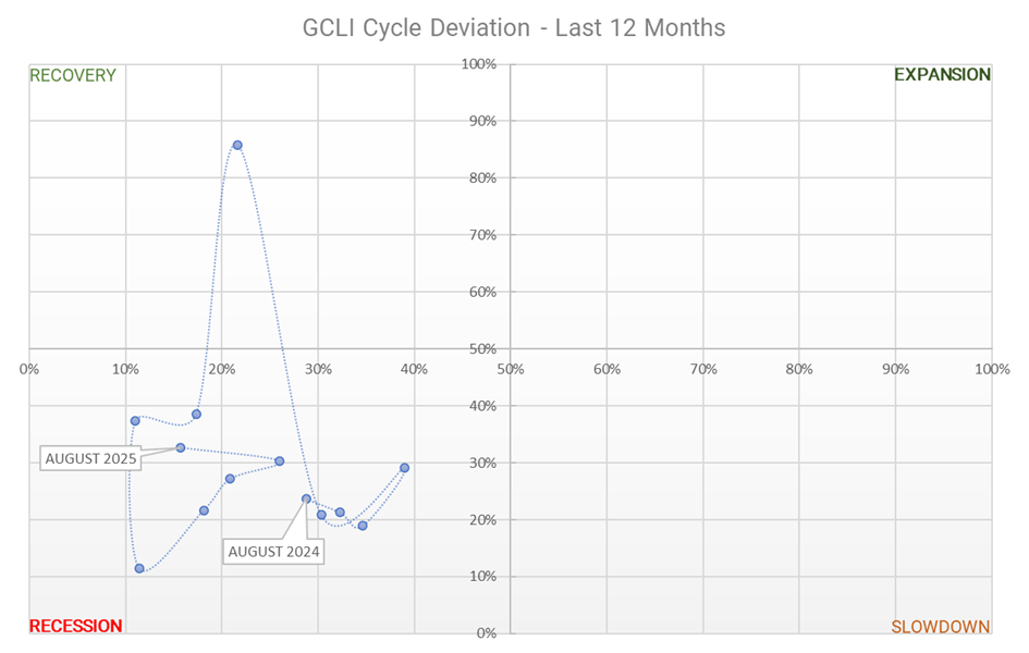 O que diz o nosso indicador proprietário de leitura ciclo econômico, GCLI (Growth Coincident Leaders Index): RECESSION (recessão)