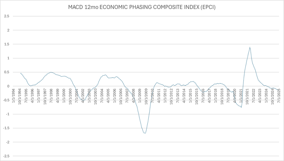 O objetivo do EPCI, ou Índice Composto de Fases Econômicas com MACD de 12 Meses (EPCI), é acompanhar o momentum direcional do ciclo econômico completo, resumindo os pontos de inflexão observados nos indicadores antecedentes, coincidentes e defasados. O MACD de 12 meses é aplicado ao composto para destacar pontos de inflexão nas tendências de crescimento, suavizando a volatilidade de curto prazo enquanto preserva a estrutura temporal das transições do ciclo econômico.