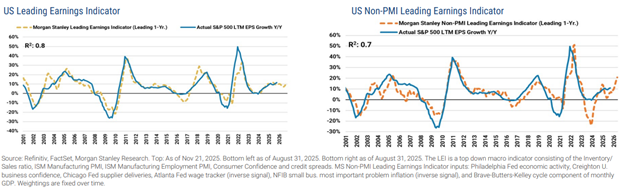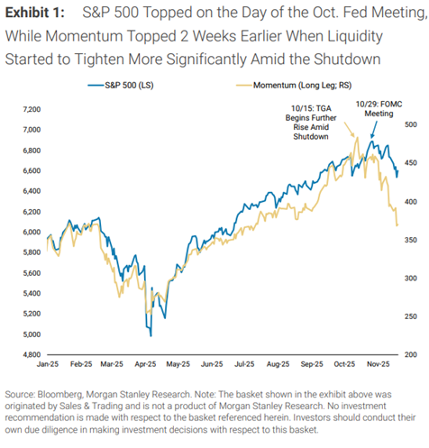 Outro fator que pesou foi o ambiente restritivo de liquidez no início do mês. O saldo de caixa do Departamento do Tesouro Americano subiu acentuadamente durante o shutdown do governo, drenando reservas do sistema e pressionando os mercados de financiamento de curto prazo. Segmentos sensíveis à liquidez, como small caps e ações de momentum, ligadas a “tecnologia especulativa”, tiveram desempenho significativamente inferior, ofuscando a atenção que os resultados fortes das maiores empresas teria numa situação menos dramática.