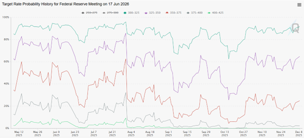 Diante desse conjunto de forças, não há clareza sobre qual impacto prevalecerá no curto prazo. O que podemos afirmar é que a combinação entre o otimismo ainda presente no mercado acionário, o ritmo intenso de investimentos em IA, a elevada concentração de retornos e, ao mesmo tempo, sinais de enfraquecimento do mercado de trabalho e de estrangulamento financeiro em parte da população, tem acelerado as expectativas de cortes de juros. Isso torna 2026 um ano particularmente desafiador para “escolher um lado”: o cenário sugere tanto potenciais de continuidade quanto riscos de reversão.